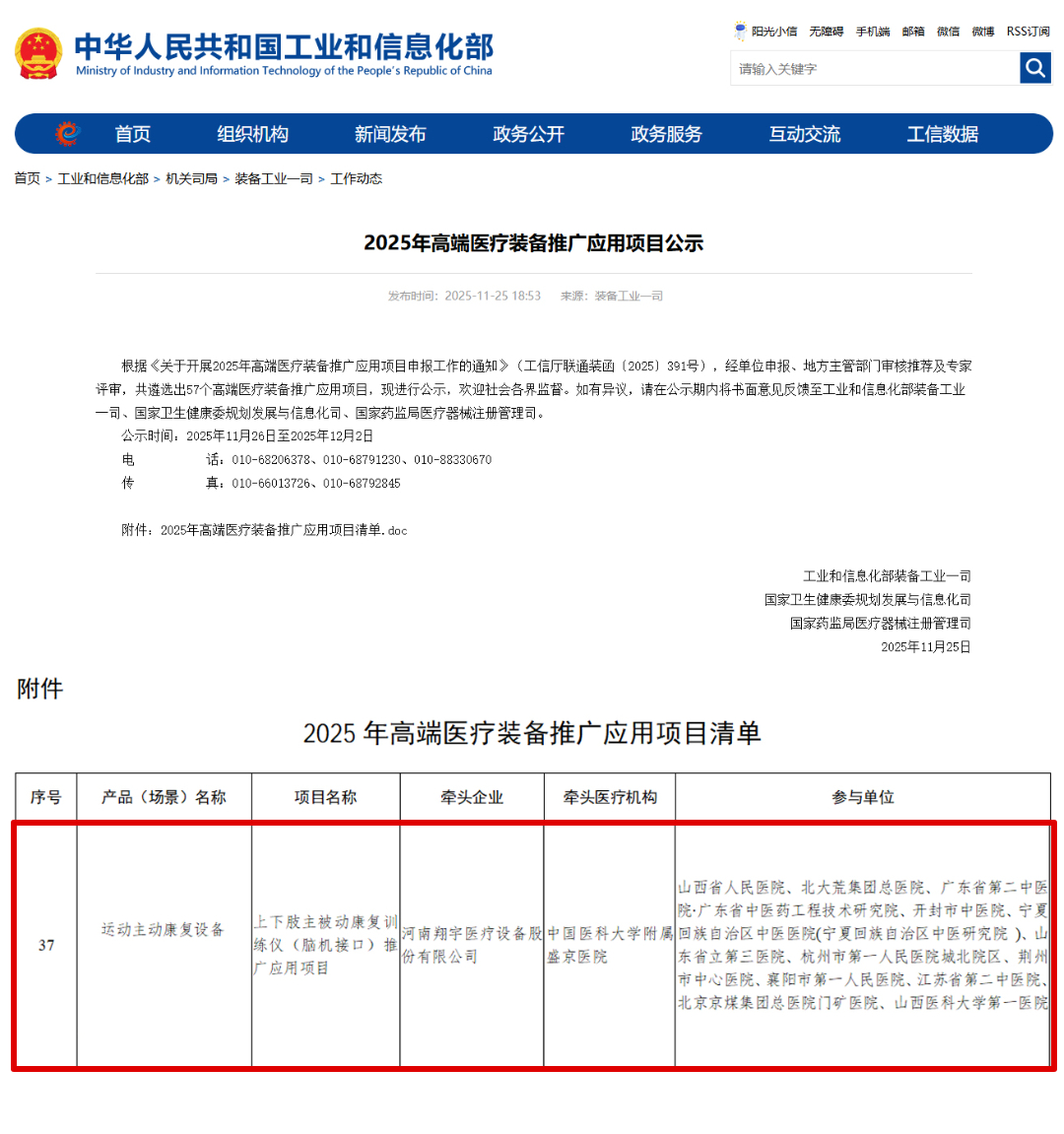 翔宇医疗与中国医科大学附属盛京医院牵头申报的上下肢主被动康复训练仪(脑机接口)推广应用项目成功上榜!这标志着翔宇医疗自主研发的脑机接口康复技术已获得国家层面认可,将为神经损伤患者功能重建带来革命性突破。